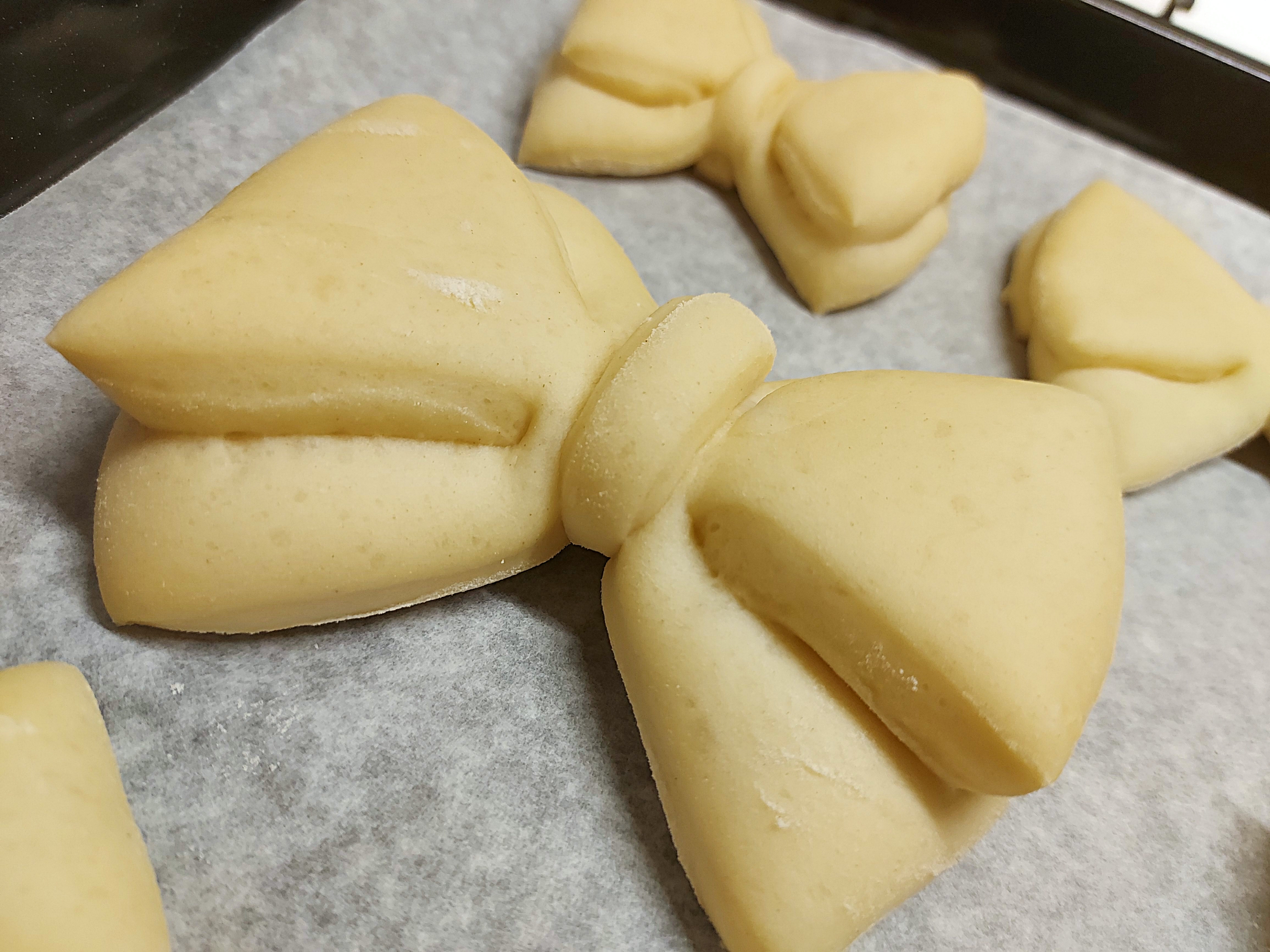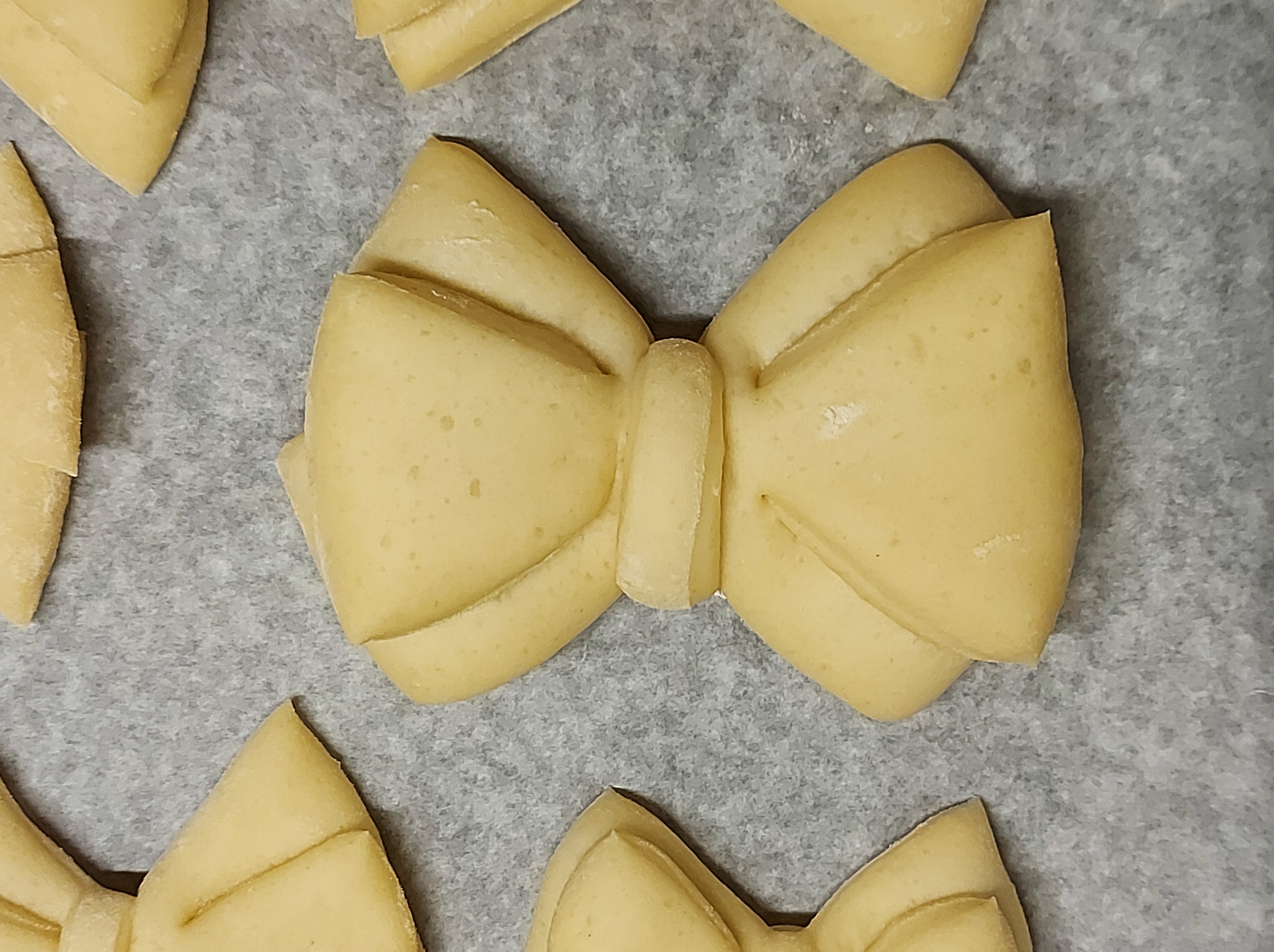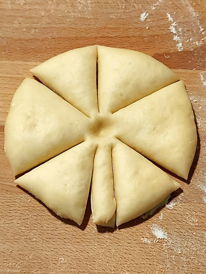 Componete i fiocchi: dividete il panetto in 8 pezzi (per ottenere delle brioches delle dimensioni di un croissant da colazione) oppure in 16 (per brioches più piccole), e fate delle palline che schiaccerete fino ad ottenere dei cerchi di pasta alti circa mezzo centimetro. Procedete poi a tagliarli come in foto: