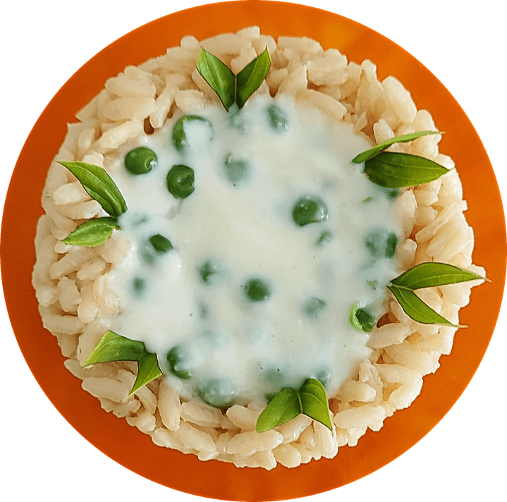 Risotto con crema al Grana Padano, piselli e salsa di peperoni