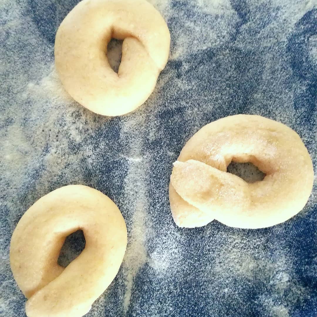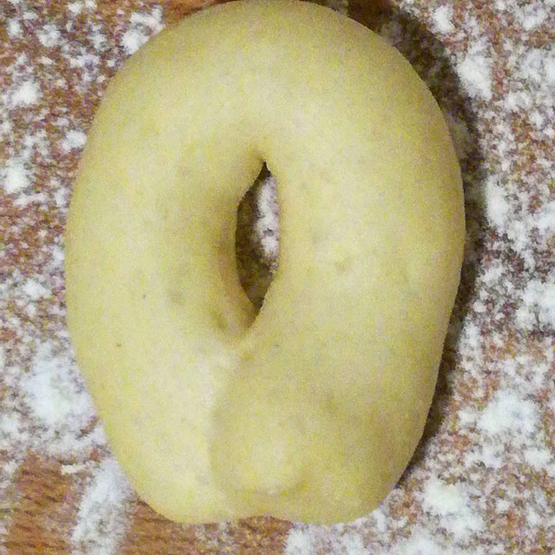 Tagliate 30 pezzetti di pasta, da ognuno ricavate dei cordoncini e poi unitene le estremità per dare forma alle ciambelle. Mettetele a lievitare in luogo tiepido per almeno 1 ora: dovranno gonfiarsi come si vede nella seconda foto.