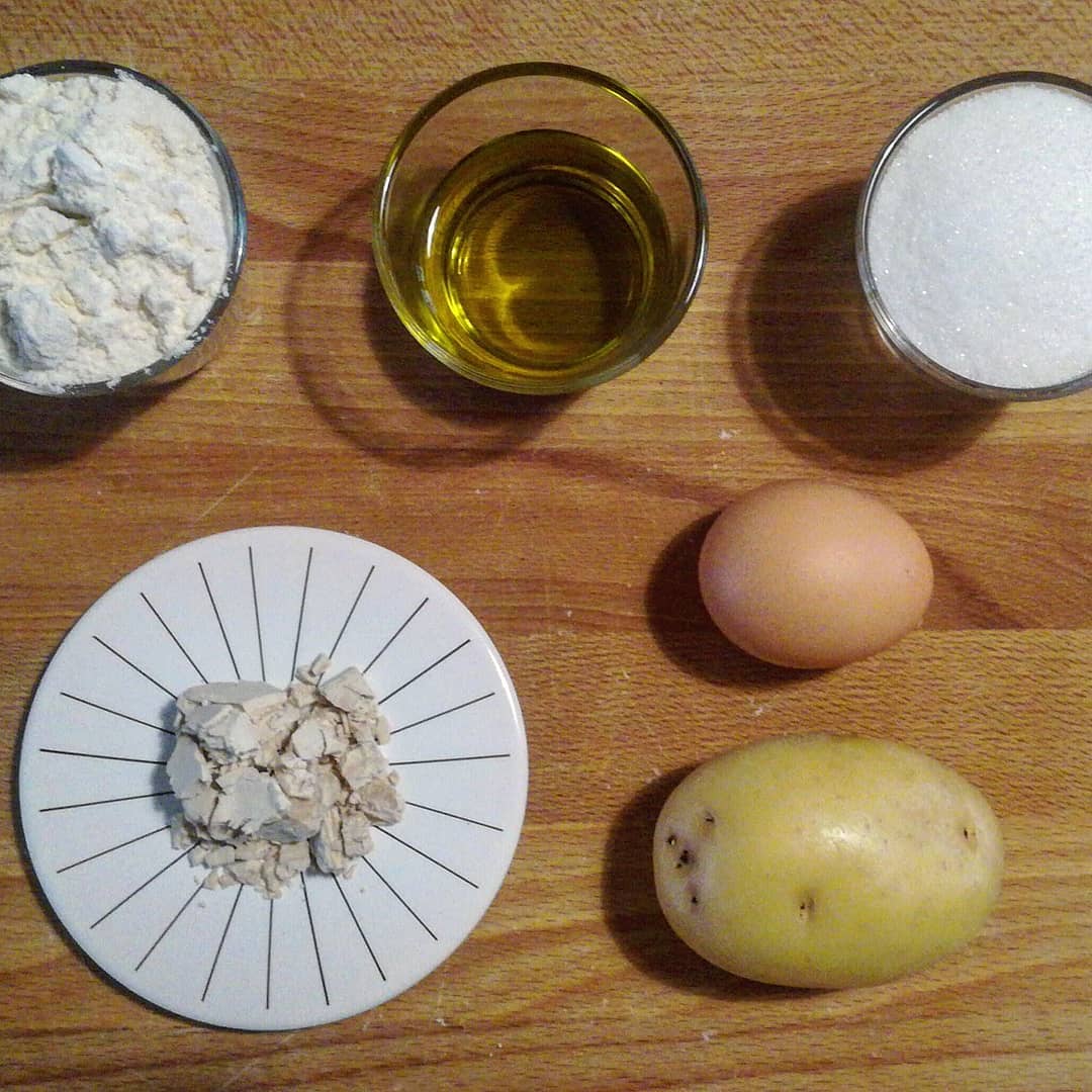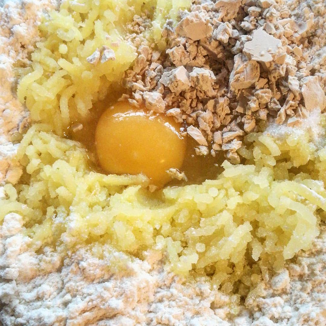Preparate l’impasto: lessate le patate e passatele nello schiacciapatate, disponetele su un piano di lavoro creando una fontana e, quando sono ancora tiepide, sbriciolateci sopra il lievito di birra fresco. Inserite al centro della fontana l’uovo, lo zucchero, l’olio evo e infine, intorno alle patate, la farina: quindi mescolate e lavorate l’impasto finché non sarà liscio e omogeneo.