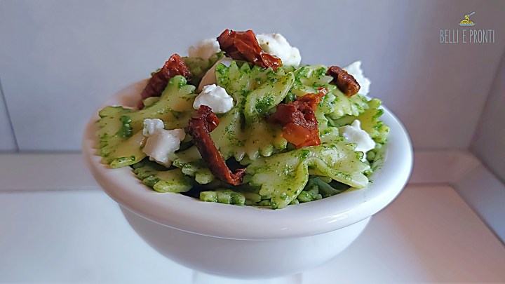 Le ali delle farfalle sostengono bene sia i pezzetti di pomodori secchi che la stracciata di mozzarella di bufala, e la callosità del nodo delle farfalle di pasta è la consistenza ideale per supportare questo sapore verace. 🦋