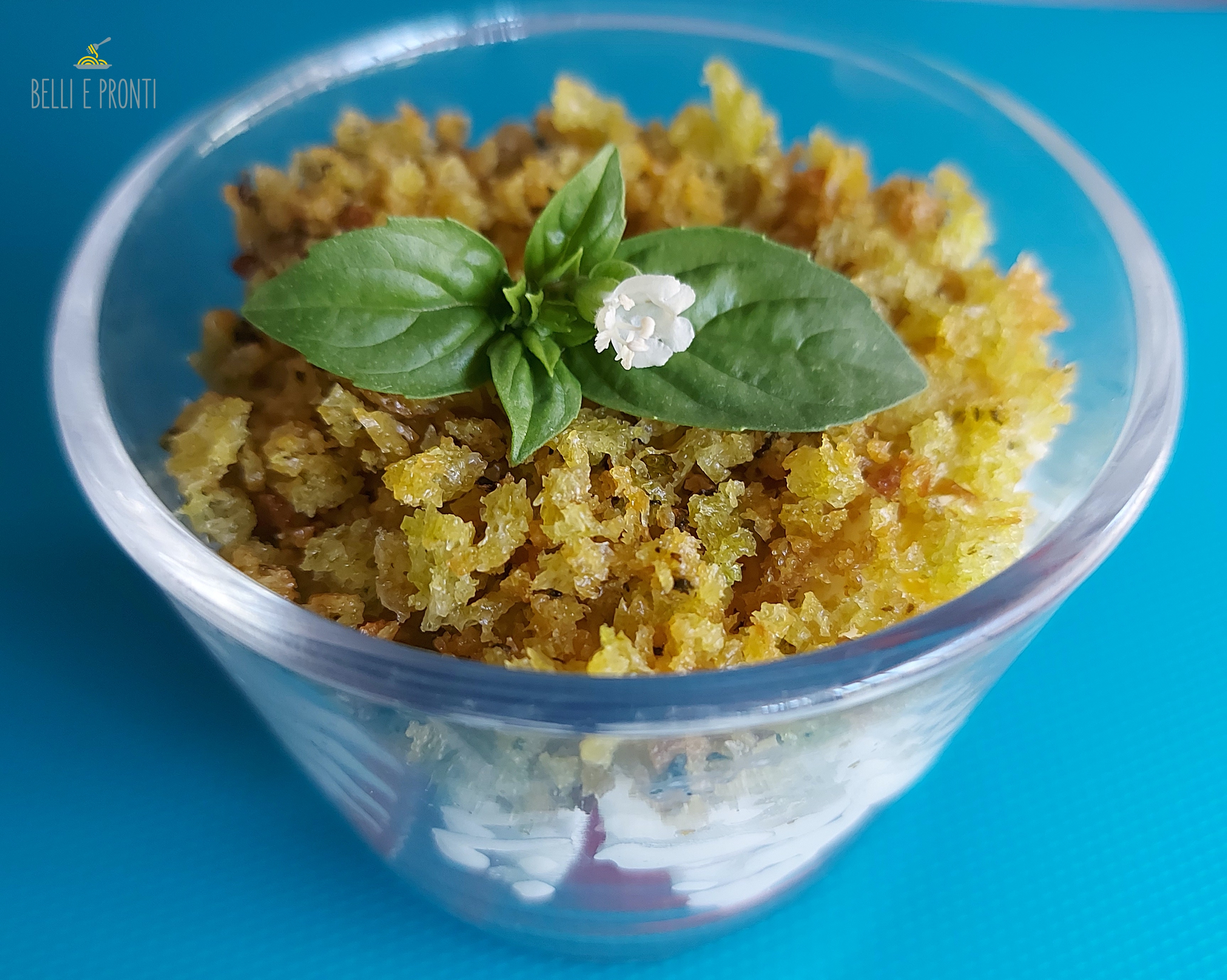 Per il crumble: frullate in un mixer il pane tagliato a pezzi, il basilico lavato ed un filo d’olio, fino a che il basilico non si sarà mescolato omogeneamente con la mollica. Soffriggete in padella l’aglio con un filo d’olio, poi aggiungete la mollica aromatizzata e saltate a fiamma vivace finché non diventa croccante.