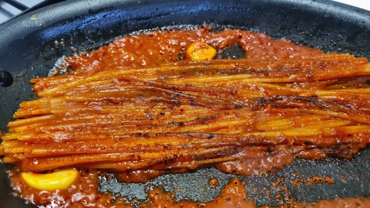 In teoria ci vorrebbe una padella di ferro, in modo che raggiunga temperature ragguardevoli e crei quella crosticina croccantina e bruciaticcia tipica di questa particolarissima ricetta di spaghetti; ma, siccome con la padella di ferro poi dobbiamo grattare il fondo a mano per ripulirla, io ho usato una padella antiaderente e sono riuscita lo stesso nell’intento di fare attaccare gli spaghetti al fondo. È una questione di fiamma vivace! 🔥