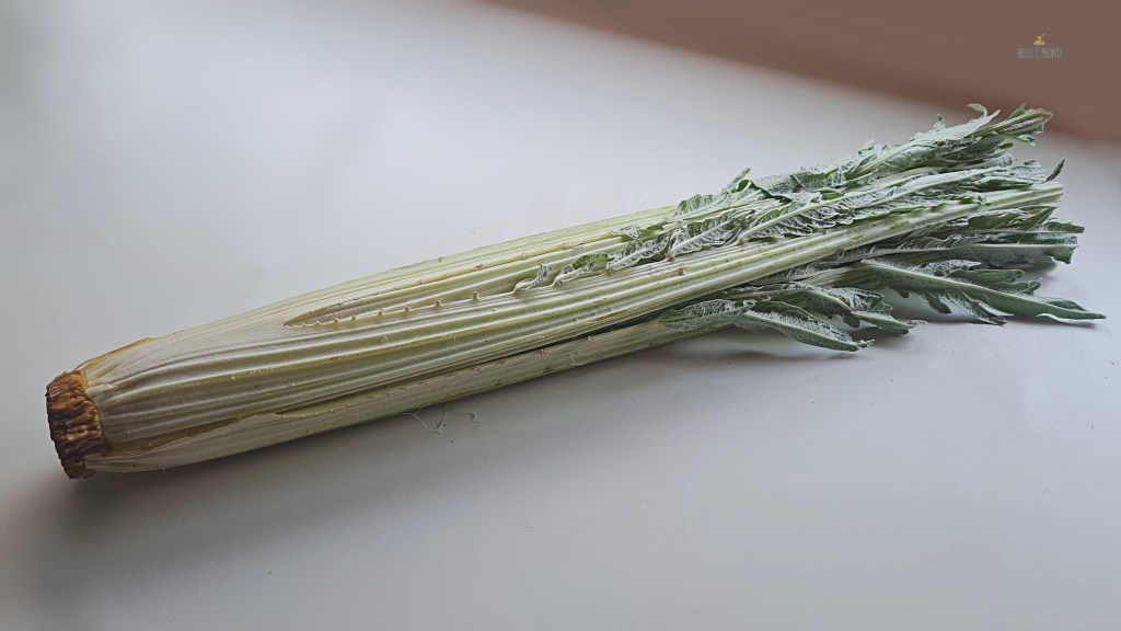 È fondamentale il processo di sbianchitura, cioè fare una precottura in acqua bollente e poi eliminare l’acqua per portare via tutto l’amaro del cardo. A questo punto il cardo diventa dolce, morbido e di un delicatissimo colore verde tenero.😍