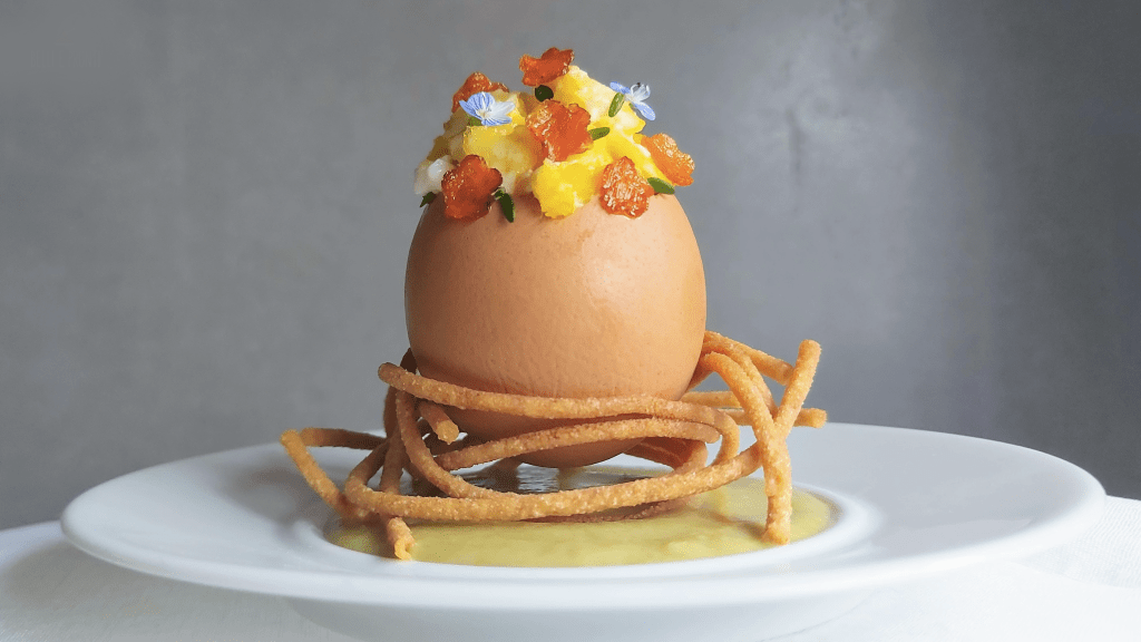 Vellutata di asparagi a specchio, un nido di spaghetti fritti, e un guscio d’uovo pieno di vellutata di asparagi e uova strapazzate al timo.