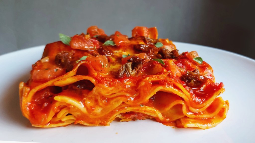 Per condire le classiche sfoglie della lasagna utilizziamo salsa di pomodoro, pomodorini freschi e pomodori secchi.