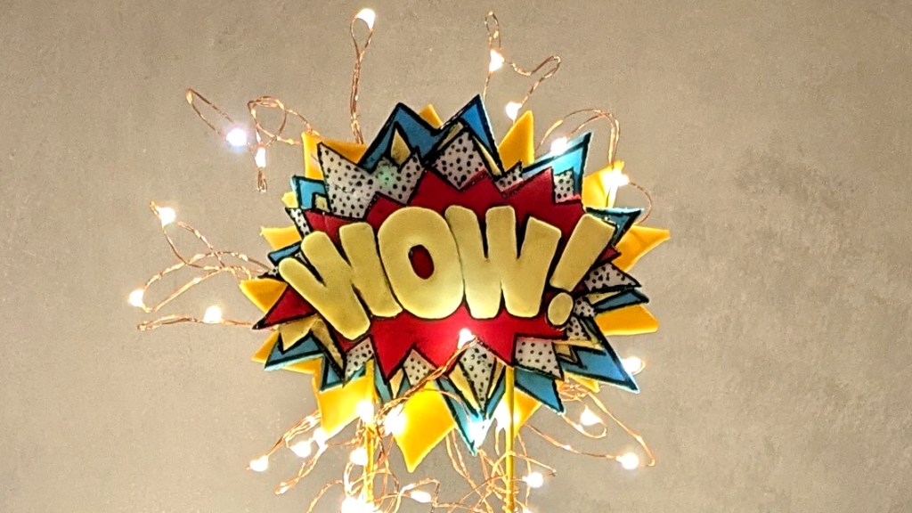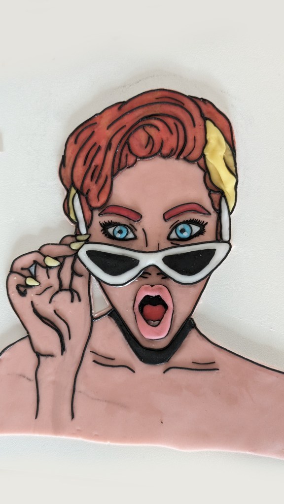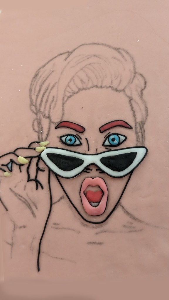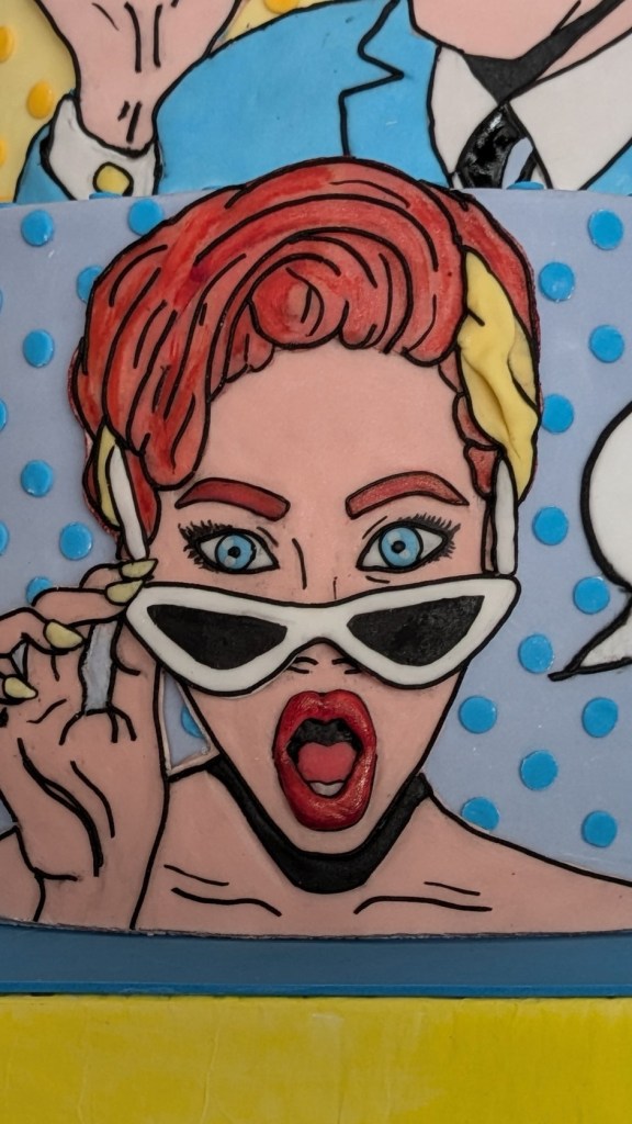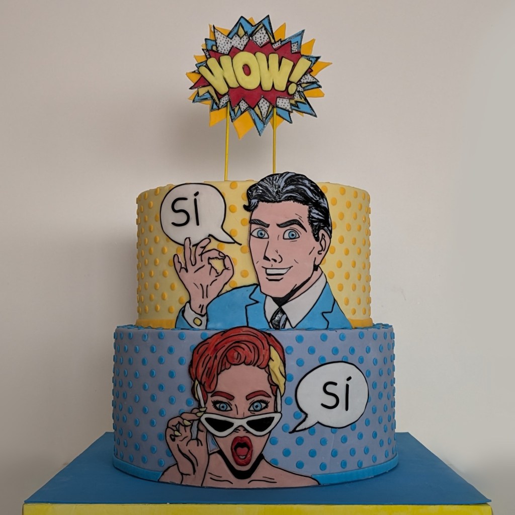 Quella che vedete in foto è una torta finta per matrimonio a tema pop art, creata da noi: è completamente decorata in pasta di zucchero, niente stampe su pasta di zucchero, tutto fatto a mano in bassorilievo!