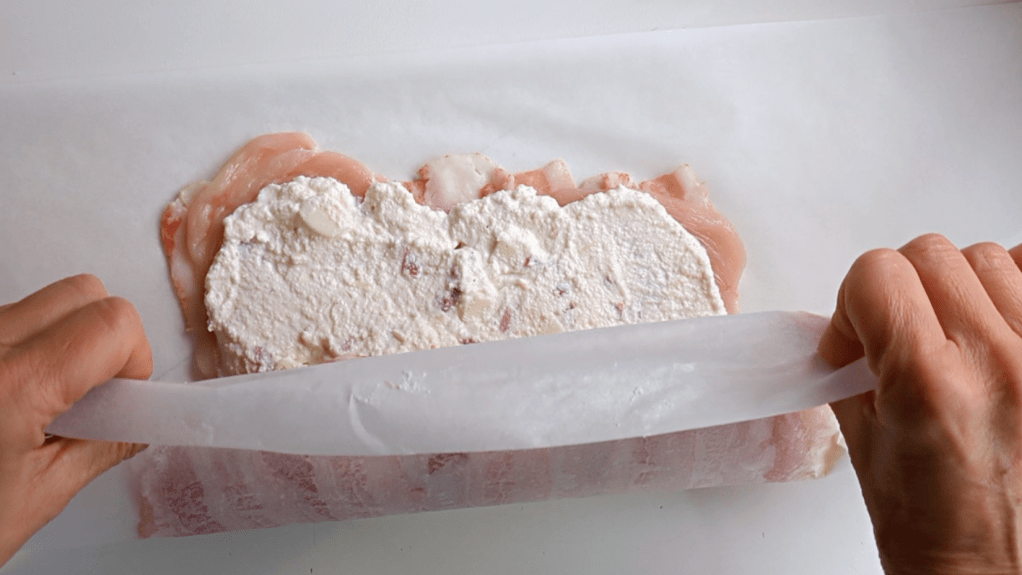 Per il petto di pollo farcito: su di un foglio di carta da forno stendete la pancetta, coprite con le fettine di petto di pollo e spalmate sul pollo la farcia precedentemente preparata. Aiutandovi con la carta da forno arrotolate.