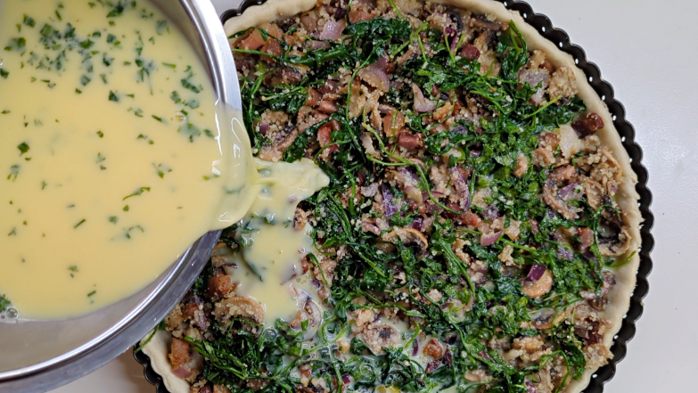 Quiche è forse più corretto. La quiche è una torta salata che prevede un ripieno solido irrorato con un composto di uova, panna e latte, che poi crea una deliziosa cremina umida intorno al ripieno.