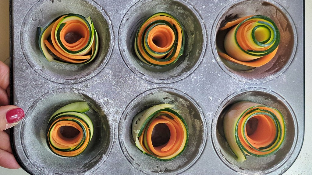 Arrotolate una fettina di carota su se stessa, poi arrotolate intorno una fettina di zucchina, e poi un’altra fettina di carota, se volete potete partire dalla zucchina e stratificare come volete.